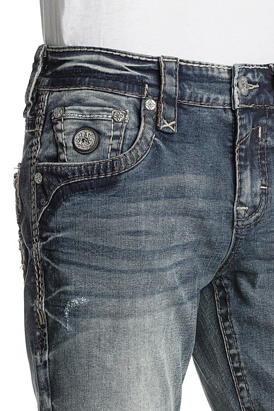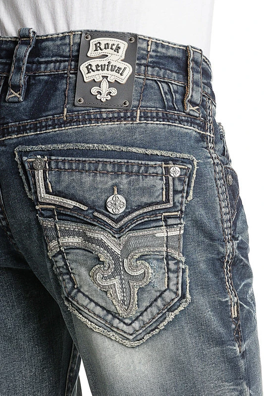 Straight cut jean styled with hand-sanding, whiskering, contrast stitching, embroidered reversed fleur de lis on faux pocket.
